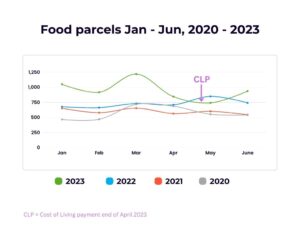 We were hopeful that the cost of living payments would make a substantial difference and we can see that the payment at the end of April did help as the figures for May were the lowest in the 6 months. Sadly, this decrease was temporary – as demand in June reverted to higher levels. (We saw a similar pattern with the payments in July and November of 2022).